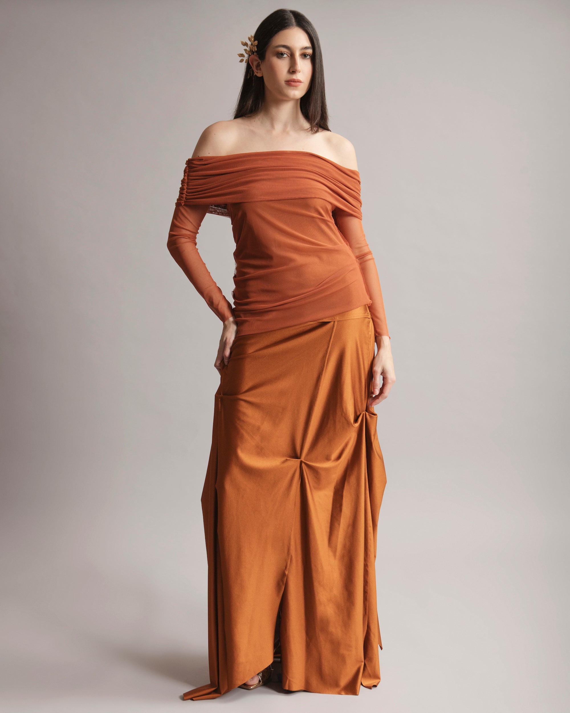 Off-shoulder mesh. Fluid silhouette.